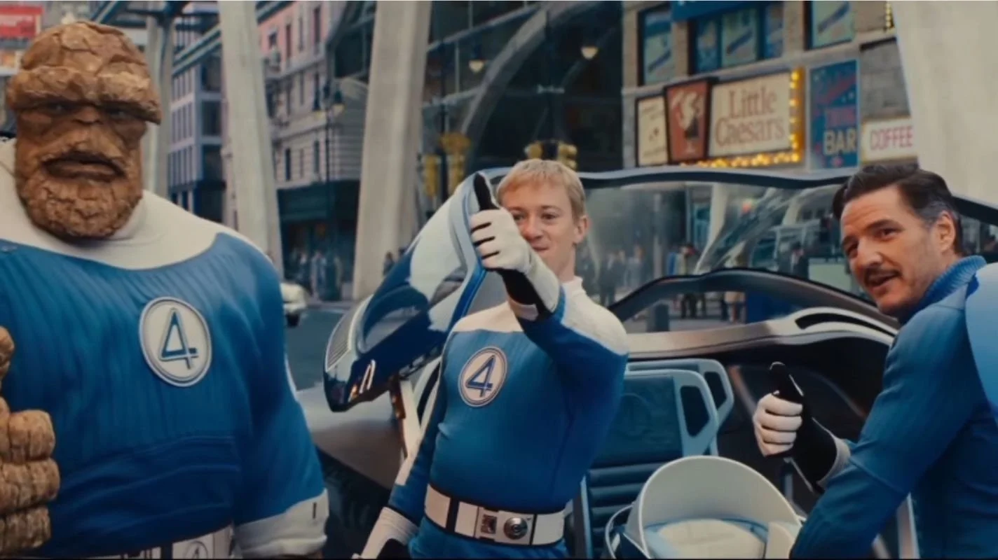 We get a SparkNotes-style montage about the four astronauts who return to Earth with powers after being exposed to cosmic rays, becoming the protectors of Earth-828. Pedro Pascal plays Reed Richards (Mr. Fantastic), Vanessa Kirby is Sue Storm (Invisible Woman), Joseph Quinn brings Johnny Storm (Human Torch) to life, and Ebon Moss-Bachrach gives us Ben Grimm (The Thing). They feel like a real family. And we meet them right in the middle of it all, just as they’re about to welcome a tiny new addition to the team.